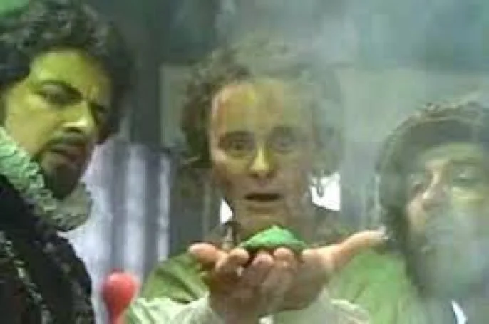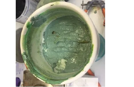 I purchased some computer circuit board fingers from e-bay that had gold rich tips. I started by trimming the gold rich elements leaving the rest of the board. Working with the largest 5 litre flask that the laboratory had I added my circuit board fingers to a solution of hydrochloric acid. This was to remove all the metals from the fingers. The mixture was agitated for around two weeks and created a deep green solution with foam on top. The green colour was not a great surprise as copper is the predominant metal in e-waste. One of the PhD students I was working with called this process ‘molecular gold panning’! The image above shows the circuit board fingers before and after the metal recovery process. This process also reminded me of the old Blackadder sketch where the character Percy is trying to be an alchemist and create some gold but instead has created ‘purest green’.