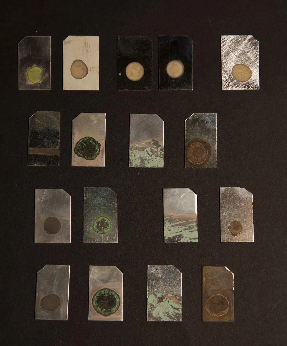 I experimented with droplets of different solutions from the metal recovery process on small pieces of different silver alloys (fine 999, sterling 925, and Britainnia 956) to see what effects could be achieved. The first solution containing all of the metals recovered (Copper, gold, cobalt, iron etc) created a beautiful effect, with the copper (the largest quantity of metal extracted) contained in the solution crystallizing around the edges as it dried out. These droplets were around one centimeter in diameter. I created a time-lapse video of this process, in which around three-and-a-half hours is condensed into a one-minute sequence. This result is fairly robust and does not break off the silver sheet easily. This is a way of colouring metals using one metal solution to plate another metal, for example sterling silver sheet, without the need for electricity. This technique also creates an even plating of one metal on the other.