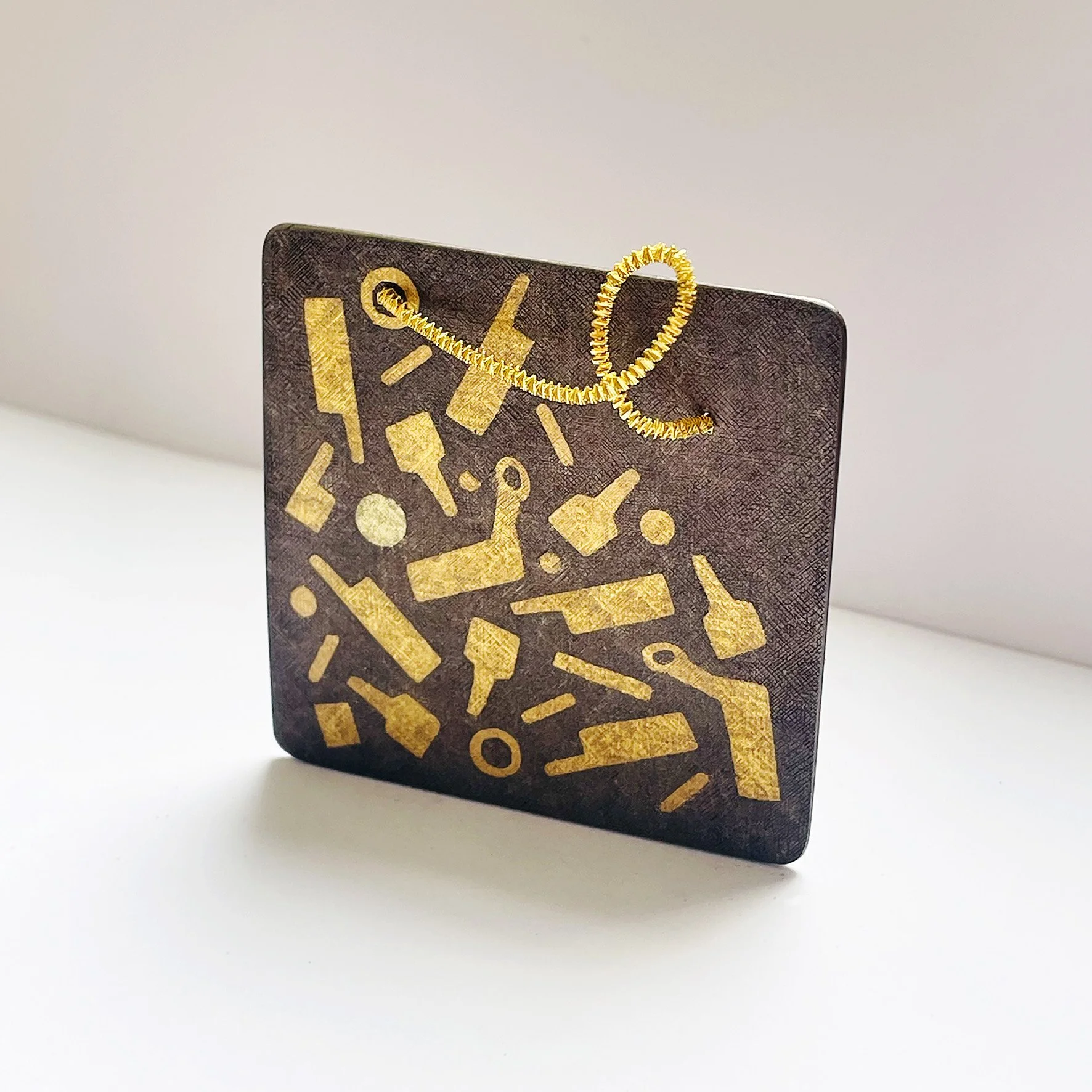 Sandra Wilson 2024, Mottainai Pendant, Shibuichi, 24ct yellow gold fingers from e-waste, 18ct green gold square and circles, yellow 8 braid cord. Nunome zogan. Image:Diarmid Weir